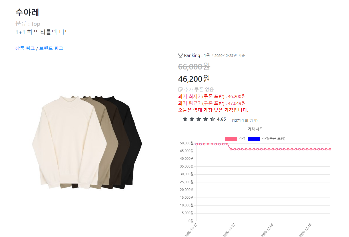 아래 가격 차트를 보시면, 11월 17일에는 50,000원이었던 옷이 12.23(수) 기준 46,200원에 판매하고 있습니다.