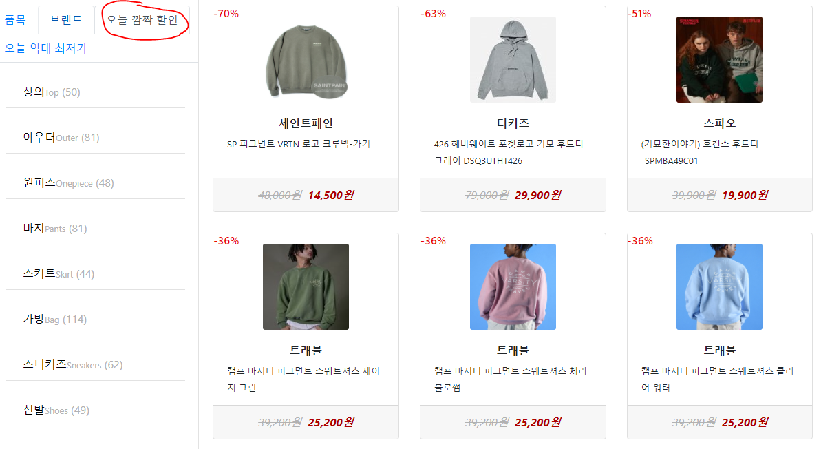 좌측 상단에는 '오늘 깜짝 할인' 이라는 탭이 있는데, 오늘만 특별히 할인하는 상품들을 보여줍니다.