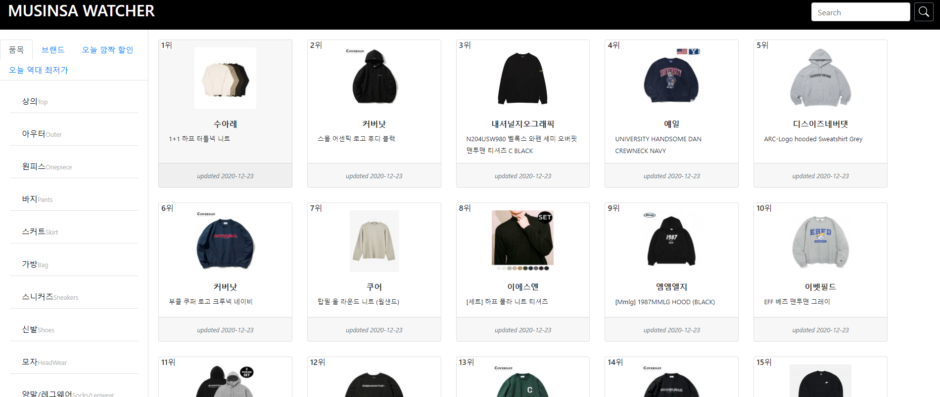 먼저 무신사 와쳐 홈페이지를 들어가면 순위대로 상품을 나열해줍니다.