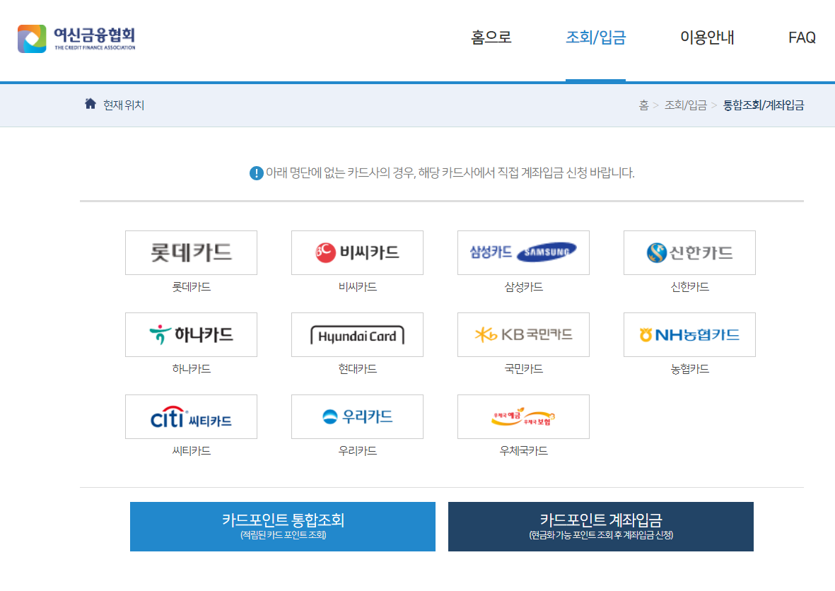 홈페이지에서 저 '카드포인트 조회'를 눌러보면 '통합조회&계좌입금'이란 버튼이 있습니다.