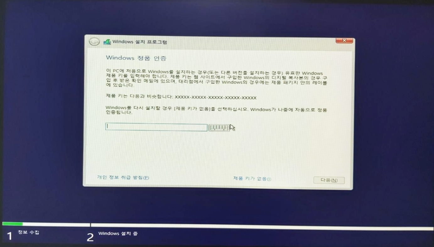 8. 제품키가 있으시면 입력하고, 없으면 '제품 키가 없음' 선택