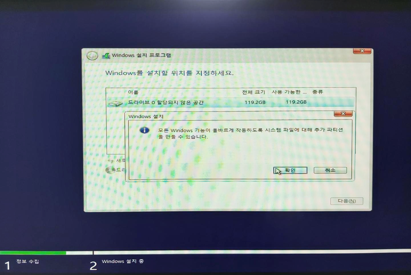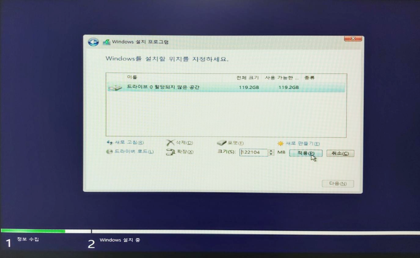 (크기는 기본으로 최대로 잡히나, 파티션을 나누고 싶으신분들은 알맞게 나누시면 됩니다.)