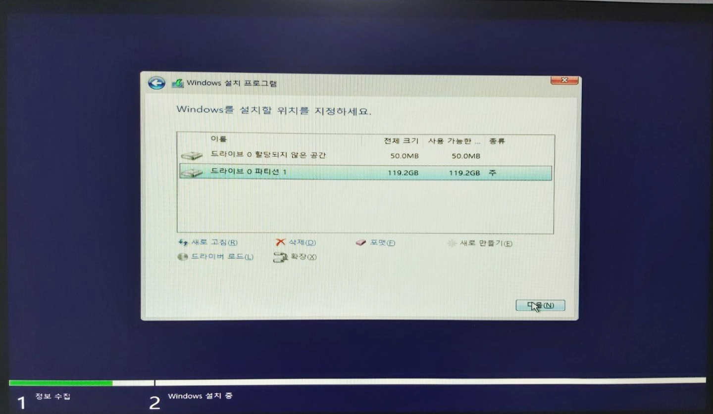 15. 드라이브 0 파티션 1 클릭하고, '다음' 클릭