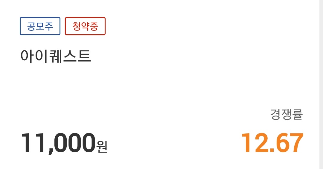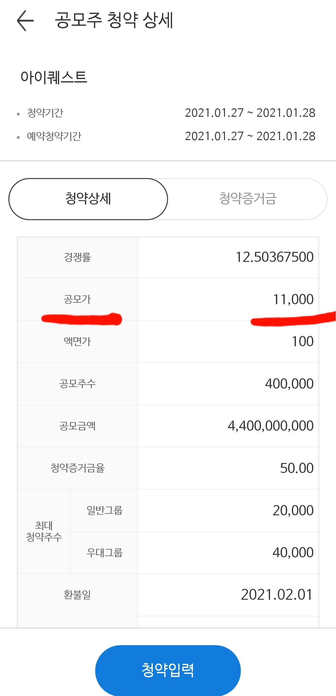 클릭하면 청약상세에서 아이퀘스트의 공모가 및 다양한 정보를 확인 할 수 있습니다. 1월27일 기준 경쟁률은 12.1 로 낮은편인 것을 알수있으나, 마감당일에 급등할 것으로 예상됩니다. 참고로 환불일은 21.02.01 으로 돈이 오래 묶이지 않아 굉장히 좋습니다.
