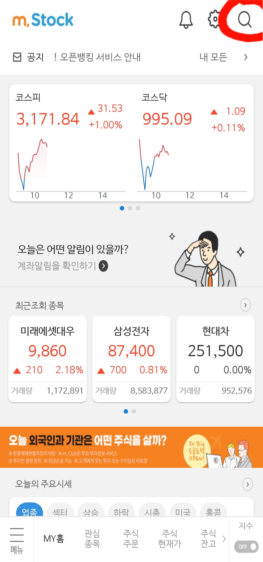 먼저 미래에셋 대우 m stock 을 설치합니다. 플레이스토어와 앱스토어에 있으며, 로그인후에 우측 상단 탐색 버튼을 누릅니다.