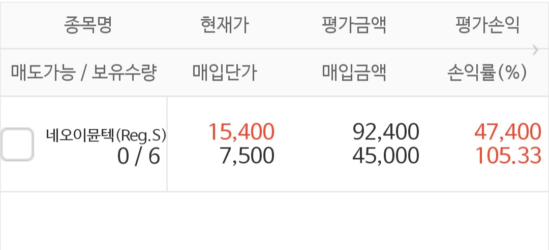 금일 상장한 네오 이뮨텍 공모주를 매도하였습니다. SK 바이오에 집중되어있어 얼마 수익을 보지 못할 것으로 예상했으나 생각보다 많은 수익을 가져다 준 것 같습니다. 다만 할일이 있어서 고점에 매도 못했던게 좀 아쉬운것 같습니다.