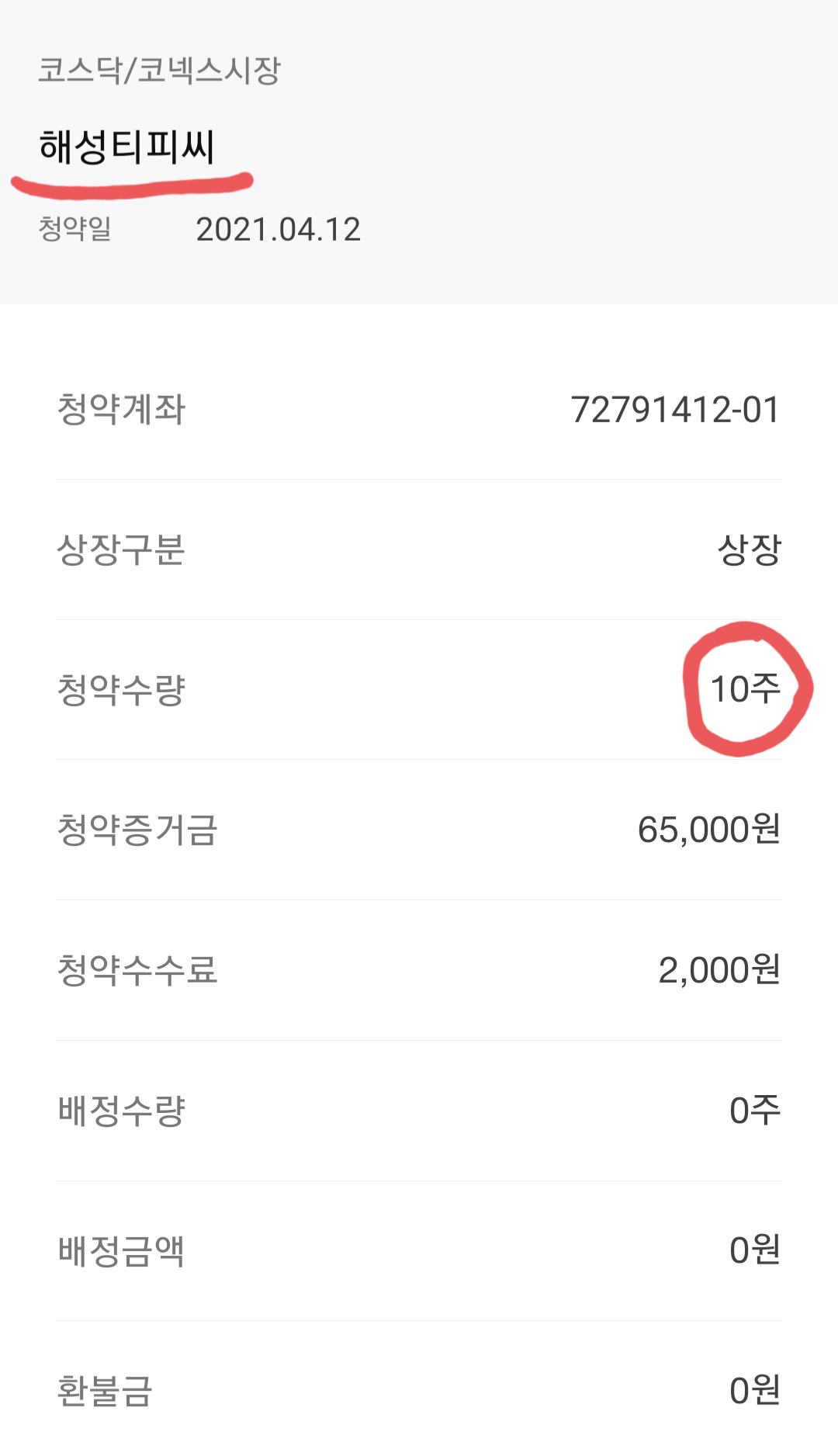 10주를 청약하기 위해서는 65,000원이 필요하며 해성티피씨 환불일은 4월 15일 (목), 상장일은 4월 21일 (수) 입니다. 확인하시고 투자하시면 좋을 것이라고 생각됩니다.