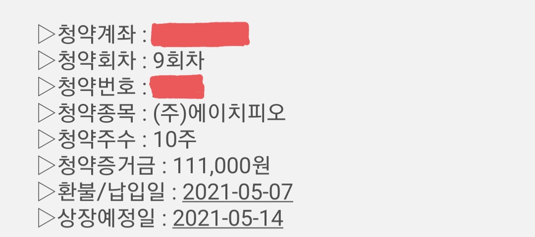 최소 청약 10주를 넣어 1주를 배정받았고, 에이치피오의 상장일은 2021년 5월 14일 금요일입니다. 항상 그랬듯이 치킨값정도는 배당 받을 수 있을것이라고 생각됩니다. 최근 SK의 공모주에 관심이 쏠리면서 기대가 없을 수도 있지만 좋은 가격을 받을 수 있지 않을까 내심 기대가 됩니다.